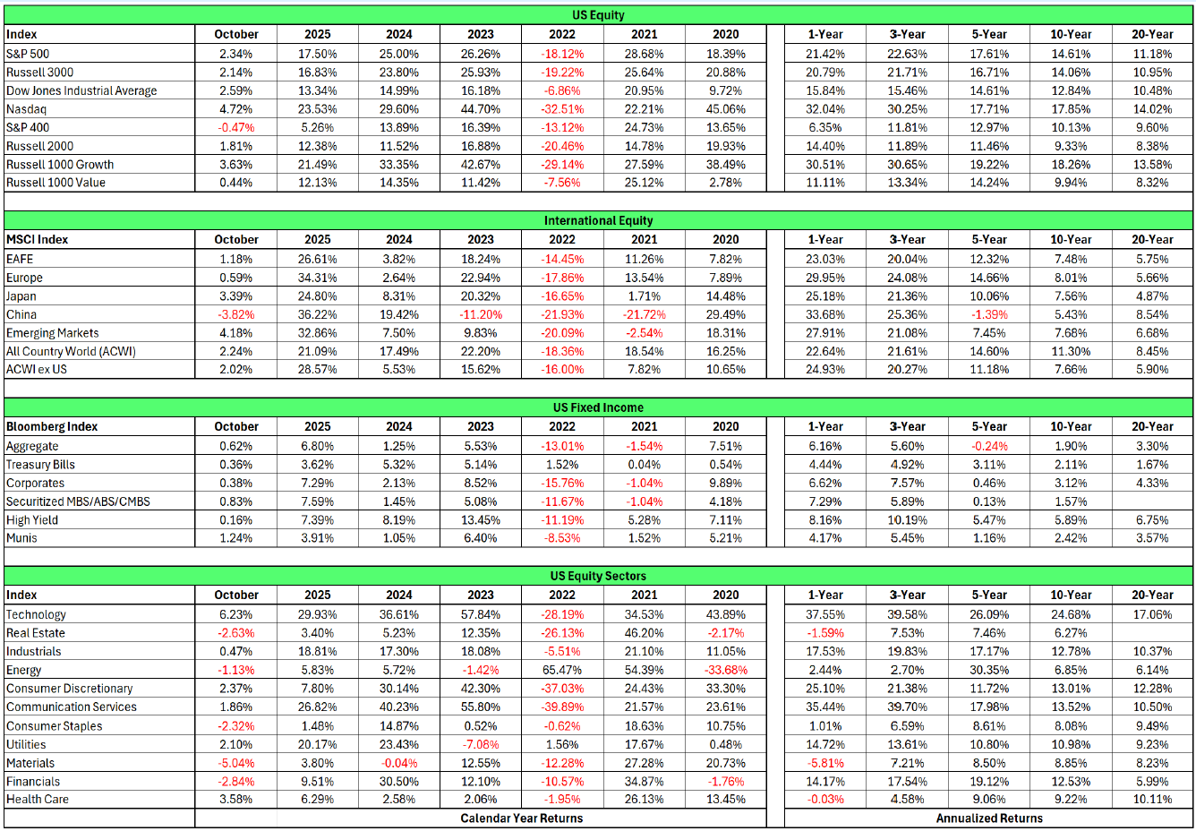 US equities advanced again in October, gaining +2.3% to mark a sixth consecutive monthly increase – the longest winning streak since 2021. The S&P 500 is now higher by +17.5% year-to-date. After a near bear market in early April, the market is up over +38% from the low. The rally was primarily driven by progress on trade deals and easing tariff uncertainty, stronger-than-expected corporate earnings, sustained optimism around artificial intelligence, and the Fed’s recent rate cuts. Market performance in recent months reinforces our belief in the importance of maintaining a disciplined long-term perspective. Please see our Principles for Long-Term Investing.