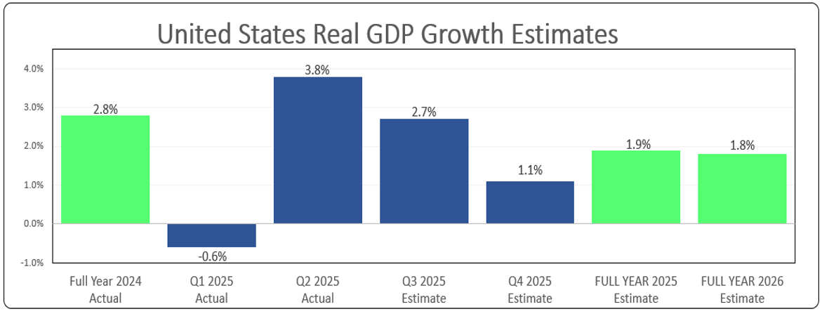 At their October 2025 meeting, the FOMC lowered the top end of the federal funds rate by 0.25% to 4.00%. In total, the Fed has reduced rates by 0.5% this year and by 1.5% since September 2024. Chair Powell acknowledged that both elements of the Fed’s dual mandate – price stability and maximum employment – have shown signs of weakening. Nevertheless, even with several key economic reports delayed by the ongoing government shutdown, the Fed chose to cut rates further to help stabilize and support a softening labor market. The Fed also announced they will stop shrinking the size of their $6.6 trillion balance sheet by reinvesting coupon payments or maturities from existing holdings, aiming to maintain liquidity and stability in short-term markets.
